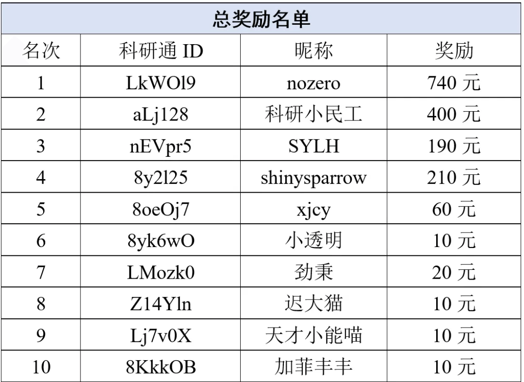 注:科研通将通过注册邮件与获奖人联系沟通发放奖金事宜,五个工作日未收到回复,视为放弃领奖。(备注:2025-04-06所有人的奖励均已发放到位)