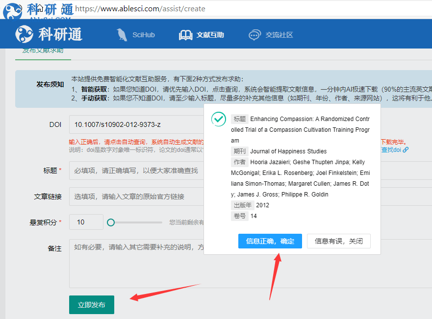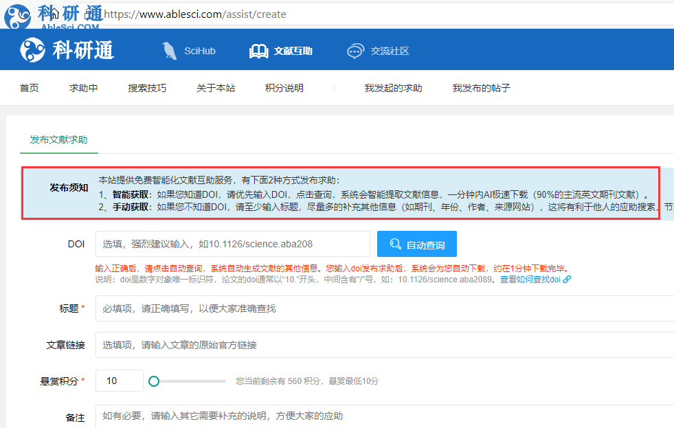 3、输入doi,点击自动查询(不知道doi是什么?请看这里https://www.ablesci.com/post/detail?id=9VP4Vw)