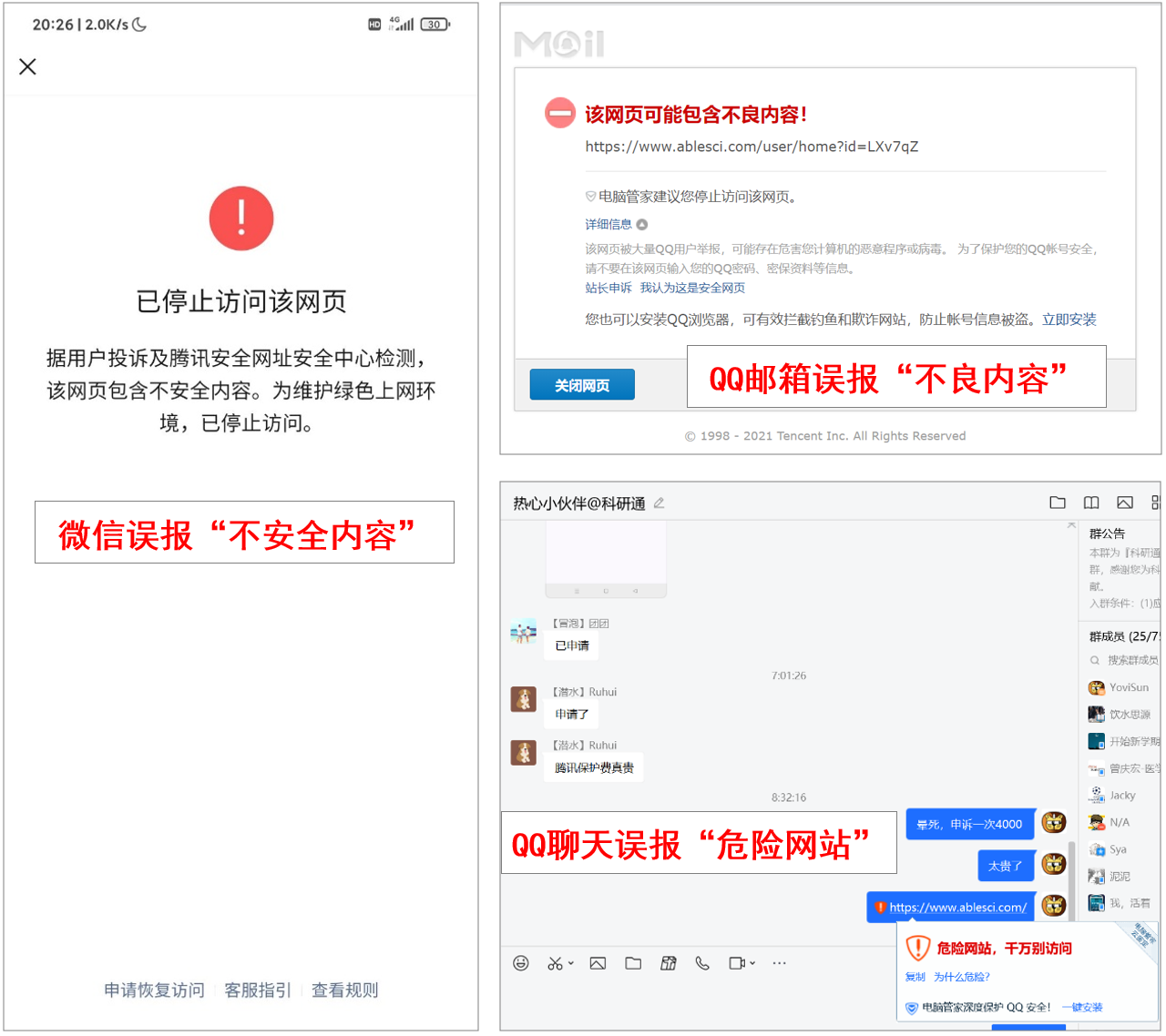 昨日,科研通网站在微信中无法打开,所有科研通的链接(www.ablesci.com)均被微信提示“该网页包含不安全内容”。经过进一步查询得知,科研通被某些别有用心的人多次举报,举报类型是“网站包含色情信息”,最终导致科研通网站在微信中无法打开。