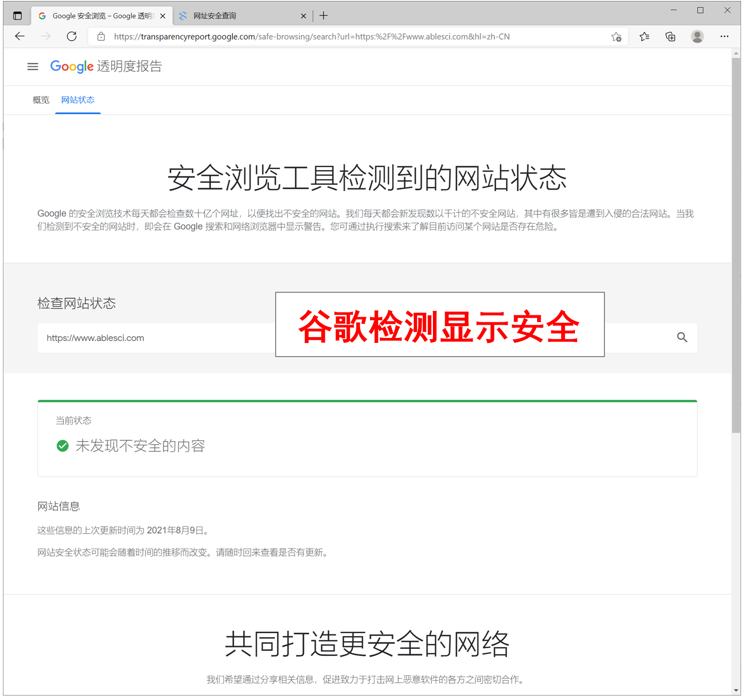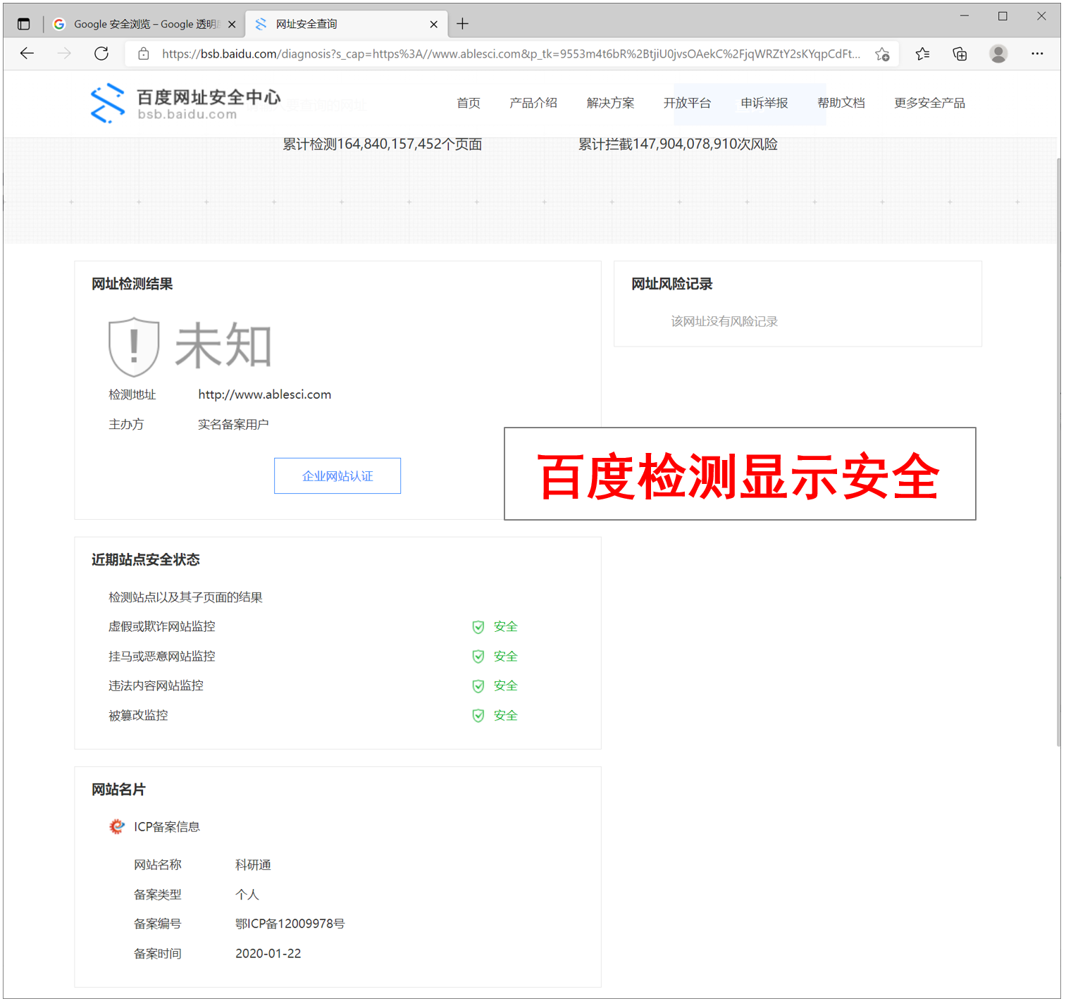 其实我平时也不太关注这些,因为自己写的网站自己清楚,绝对安全,不可能有这些问题。于是,我也自己在谷歌、百度进行了安全检测,科研通均为安全网站(如下图)。